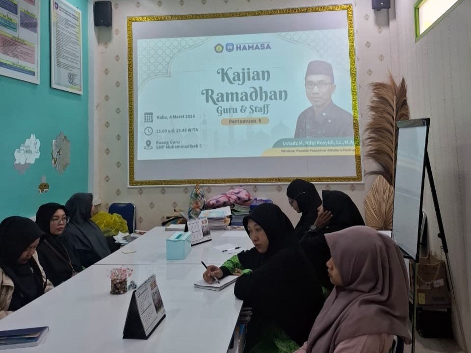 Samarinda — SMP Muhammadiyah 5 Samarinda kembali melaksanakan pertemuan keempat Kajian Ramadhan pada Rabu, 4 Maret 2026, bertempat di ruang guru SMP Muhammadiyah 5 Samarinda. Kegiatan ini masih menghadirkan pemateri yang sama, yaitu Ustadz M. Rifqi Rosyidi, Lc., M.Ag., Direktur Pondok Pesantren Modern Paciran. Kajian ini diikuti oleh kepala sekolah, para guru, staf, serta pengasuh dengan suasana yang penuh kekhidmatan dan semangat refleksi. Pada pertemuan keempat ini, Ustadz Rifqi kembali menegaskan tentang tiga peran profetik guru yang selaras dengan visi kenabian dalam pendidikan Islam. Beliau menekankan bahwa guru di lingkungan pendidikan Islam, khususnya di SMP Muhammadiyah 5 Samarinda, bukan sekadar penyampai materi, tetapi pelanjut misi para nabi dalam membentuk generasi beriman, berilmu, dan berakhlak.