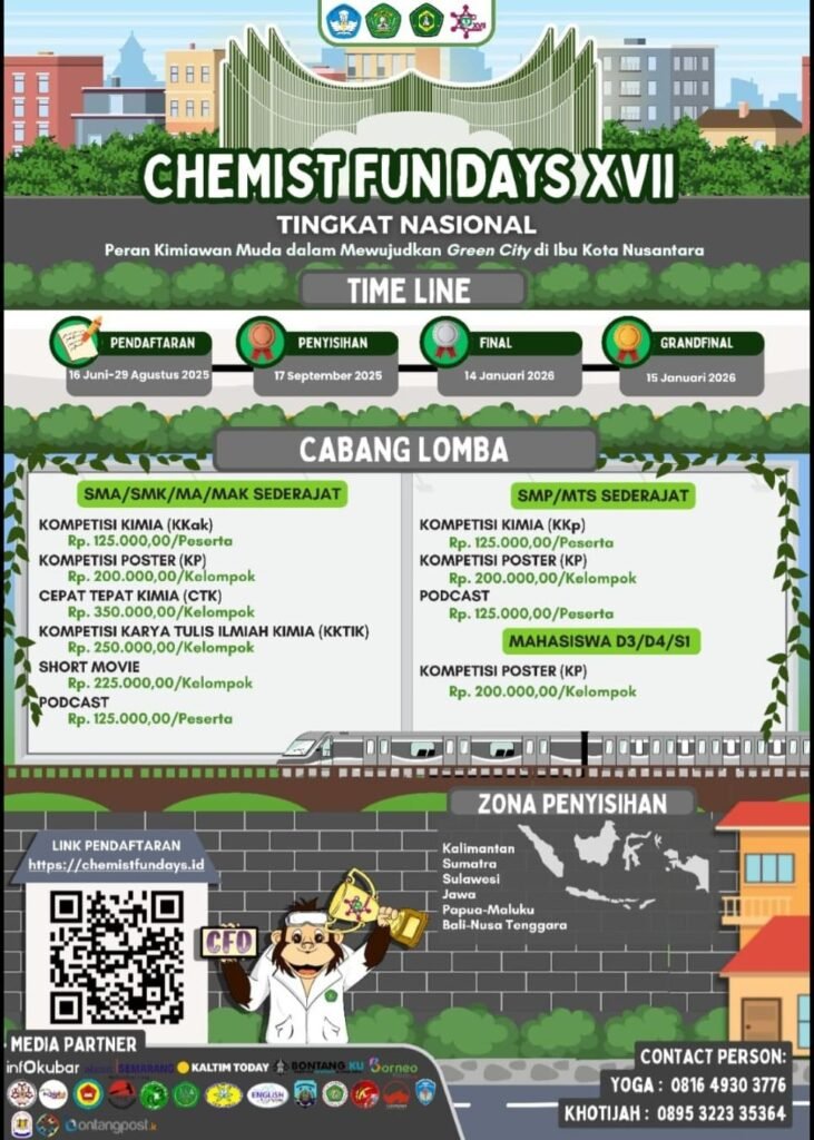 Samarinda — Santri SMP Muhammadiyah 5 Samarinda kembali menunjukkan kemampuan dan daya saingnya dalam bidang sains dengan berpartisipasi pada ajang Chemist Fun Days XVII yang diselenggarakan oleh Himpunan Mahasiswa Pendidikan Kimia (HMPK) Universitas Mulawarman. Kegiatan ini mengusung tema “Peran Kimiawan Muda dalam Mewujudkan Green City di Ibu Kota Nusantara” dan diikuti oleh peserta dari berbagai daerah.